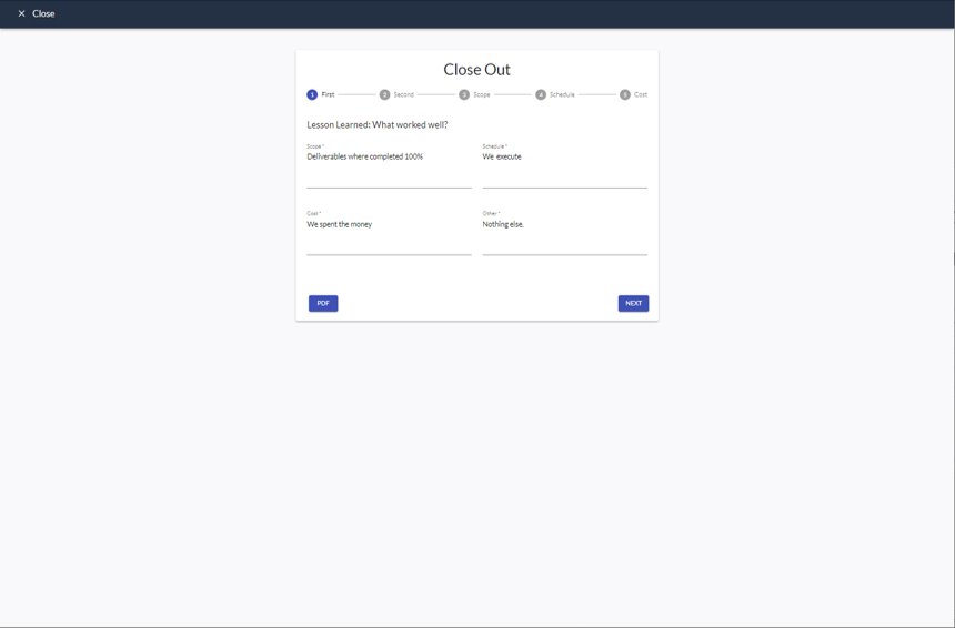 This screen displays the steps First, Second, Scope, Schedule, and Cost.