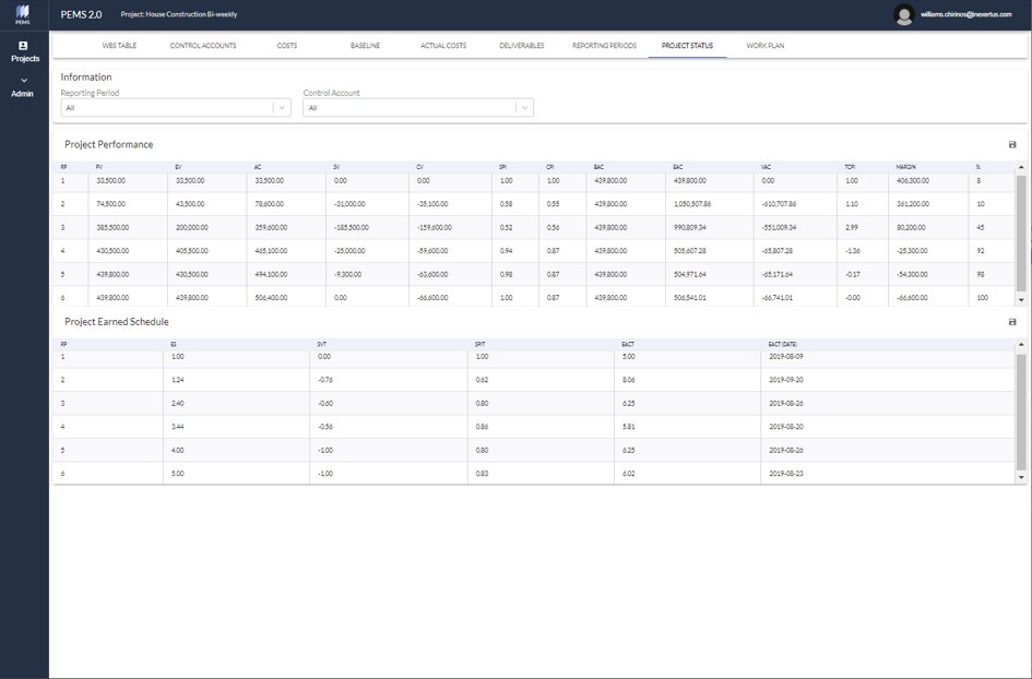 Project Performance: Percent complete and margins by control accounts/deliverables. Earned value calculations and project final cost forecast.