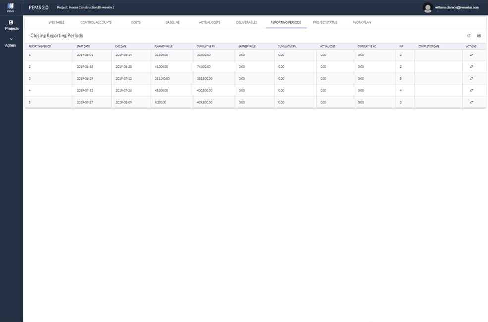 This screen displays the Reporting Period information – Planned Value, Earned Value, and Actual Cost, and records their completion dates.